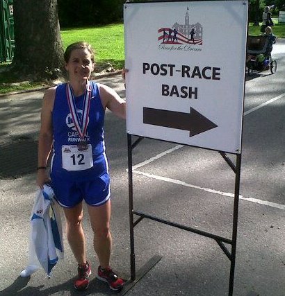 There were about 1,900 runners for the 8K but the USATF runners were able to line up in the front. We also had our own tent and our very own port-o-potty. You know I was excited about that!! There were several teams racing in the master championship. It was pretty awesome standing around and seeing these teams dressed alike and encouraging one another. I'm hoping CapRun will be able to participate in this sometime, too! So, the race begins and as always, I have my own thing to do. I'm racing against myself and trying to reach my goal for that day. But, there is something about being passed by some men wearing a bib that says age 70-74. Umm...okay. Alright, back to my goal, I enjoyed the run and was able to stay focused to finish in 39:05. That is 1 minute slower than my 8k PR from last November so I was pretty happy with that. The finish line was on a track. We ran 3/4 the way around and finished on the 50 yard line. As usual, the volunteers were so encouraging and helped make it a great race.